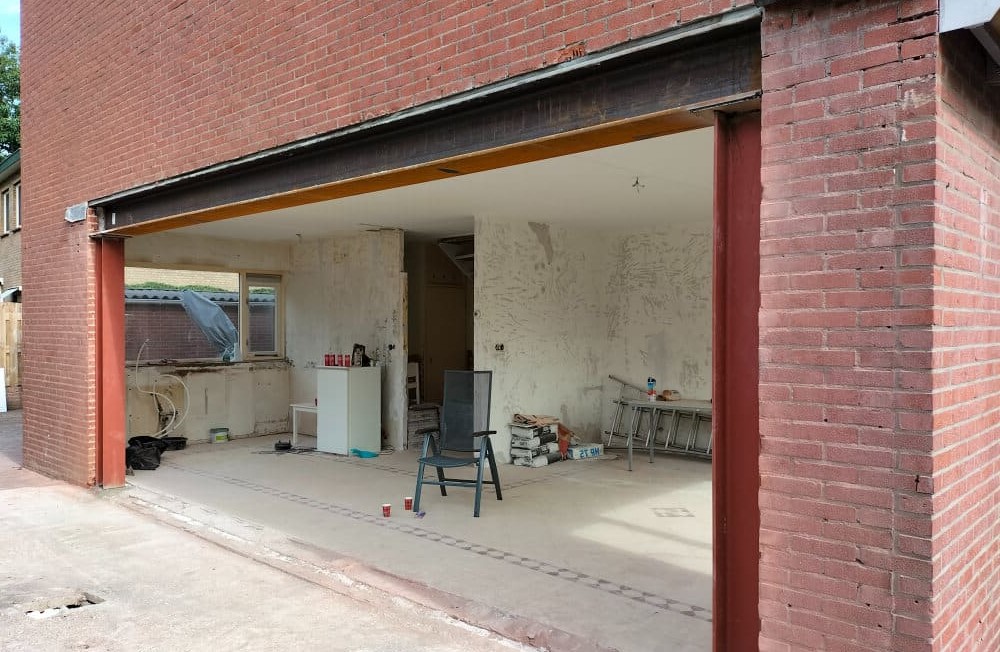Formikal Bouw zorgt voor een veilige en vakkundige uitvoering. We beginnen met het plaatsen van stempels om de bovenliggende constructie tijdelijk te ondersteunen. Vervolgens verwijderen we de bestaande muur en plaatsen we een stalen draagbalk om de belasting op te vangen. Daarna wordt de schuifpui nauwkeurig geplaatst en netjes afgewerkt.